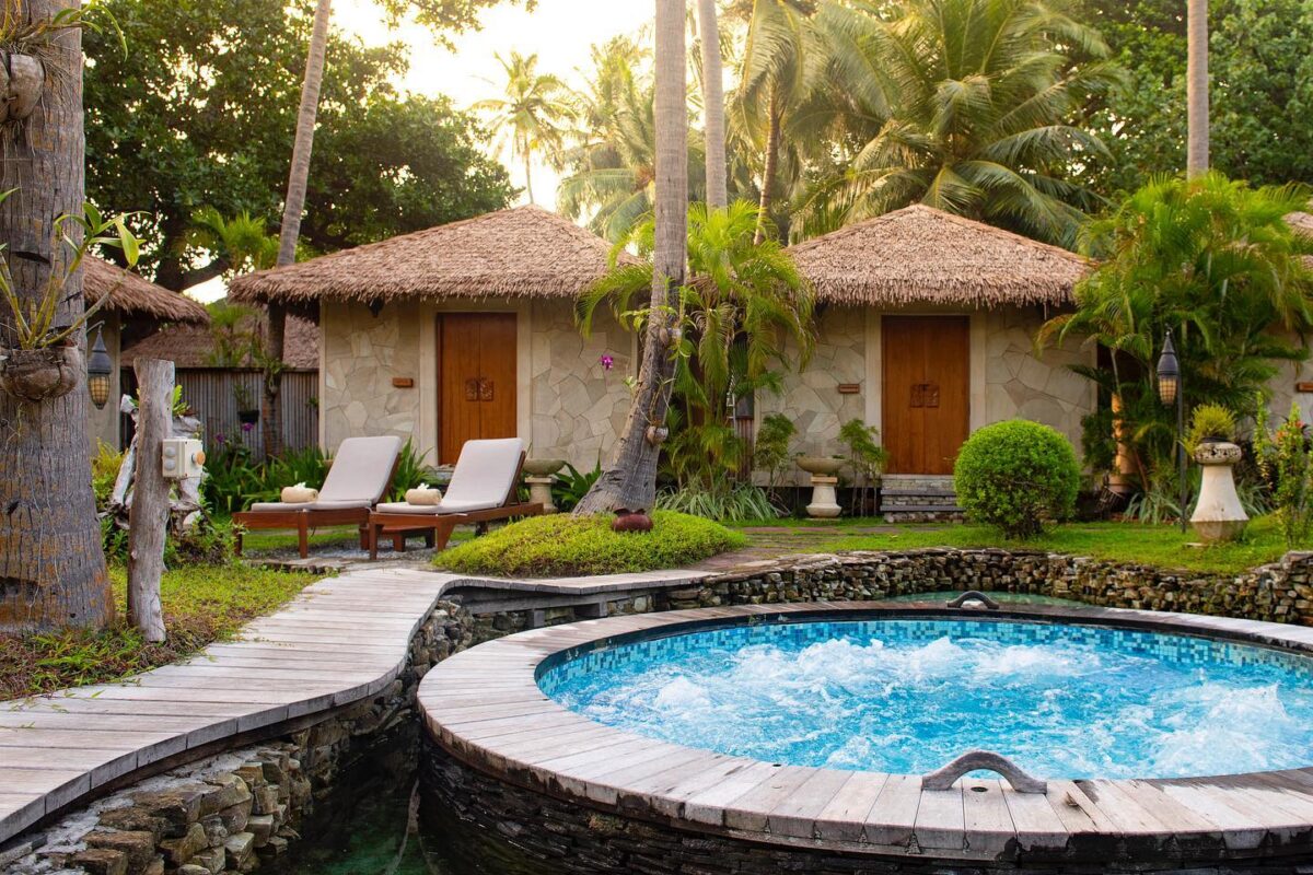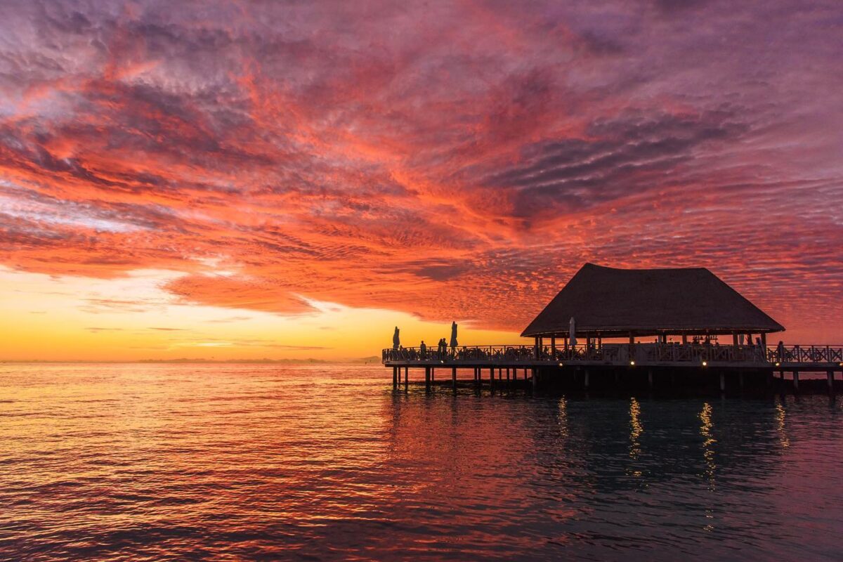 The accommodations at Bandos are designed to immerse you in the island’s natural beauty, featuring high thatched roofs and warm wooden interiors.