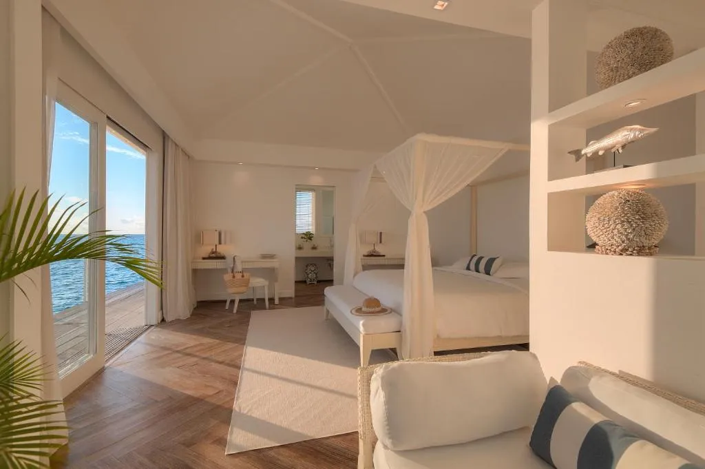 Over-Water Villas: Feature expansive private terraces with direct lagoon access, elegant canopy beds, spacious living areas, and luxury en-suite bathrooms.